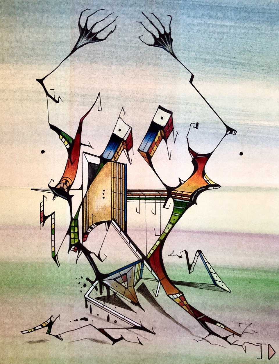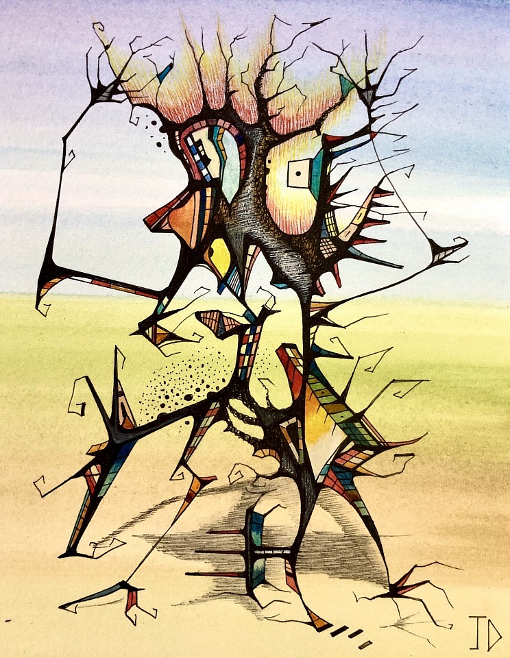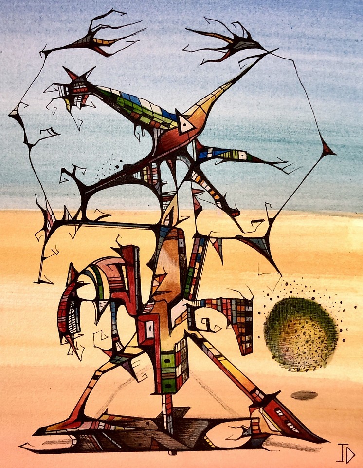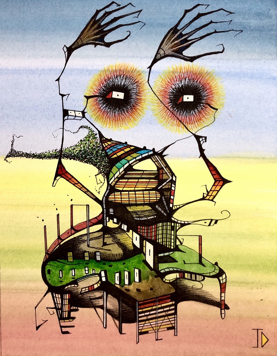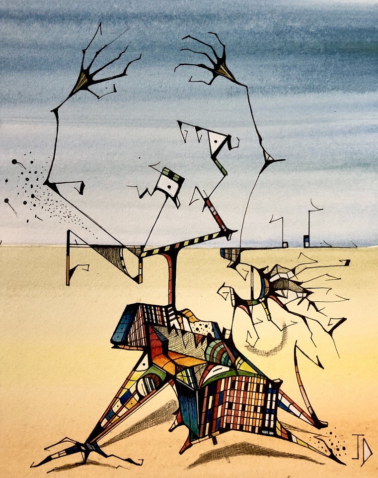 This series of surreal figures benn told a direction from the police. Watercolour and ink on arches paper 19 x 14 cm, 2023.