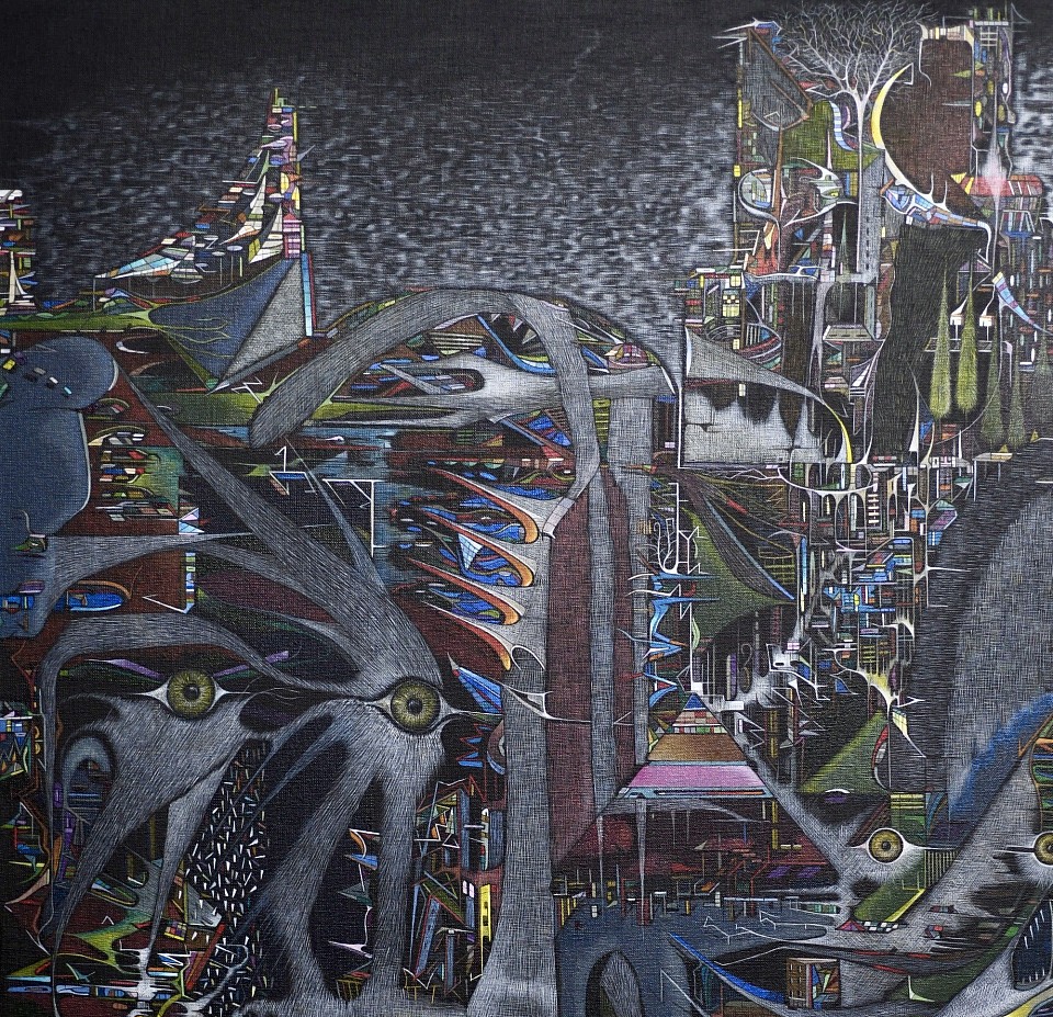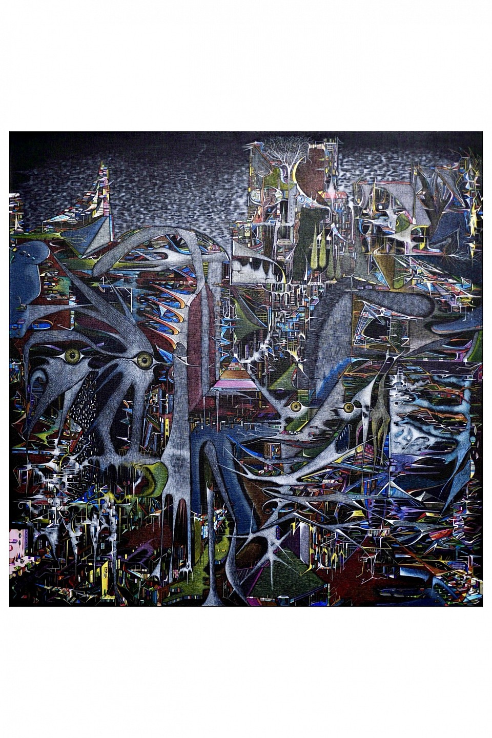 The process use of using small coloured objects a bit like bricks to build up levels of detail and surrealist action within the painting. Controlling the aspects of using dark and light to reveal different layers of the underground, above and below and the things that inhabit these places which we can see or sometimes cannot. Wonderment is a great detail in life and we all obsess about what will or will not happen within our lives or beyond,surrealism for me is a point of high imagination which we need, as we manage to create new things in this world. JD