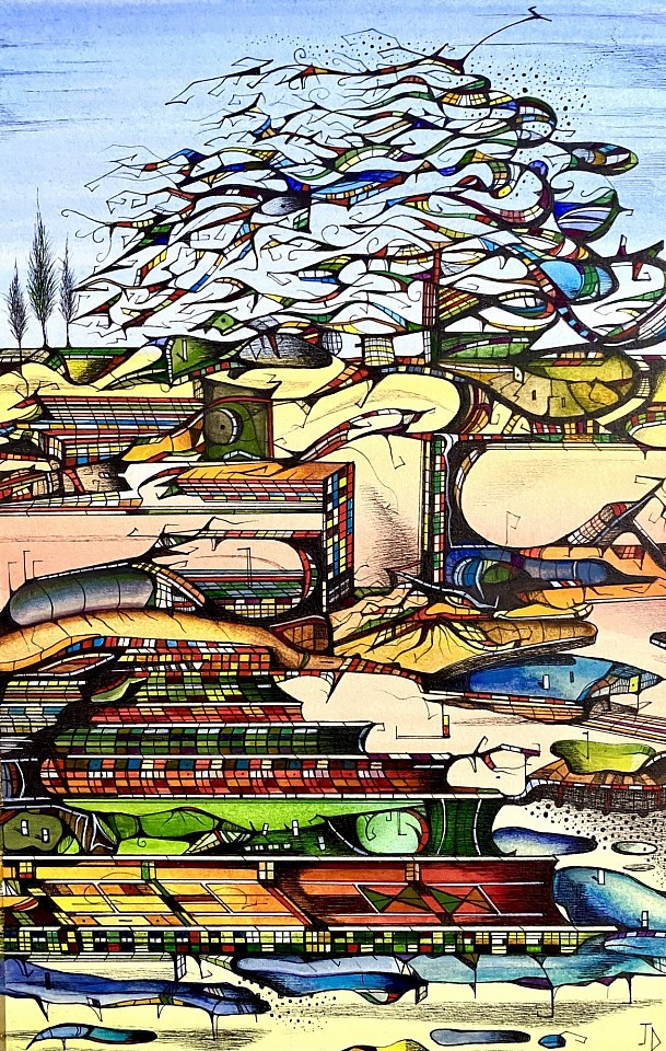 This painting is an architectural surrealist view of future significance. Where we could live in flat boxes instead of high rises.living in flat massive boxes horizontal to one another and maybe on top of each other, just a surrealist concept of the way we could live in the future. Just an alternative view or an opposite direction of population growth and land overtakement. The rooftops can also be used as landing bases for population commute and delivering goods etc. These paintings are created in professional watercolour and ink 10/0 spotter brushes and 0.05 ink pens which gives a deep detail of black line and also brings forth the watercolour paint. All produced on hot pressed arches paper. Jason Davies